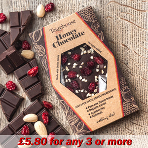Honey Chocolate made with UK honey, dark, raw, topped with hazelnuts, 75g